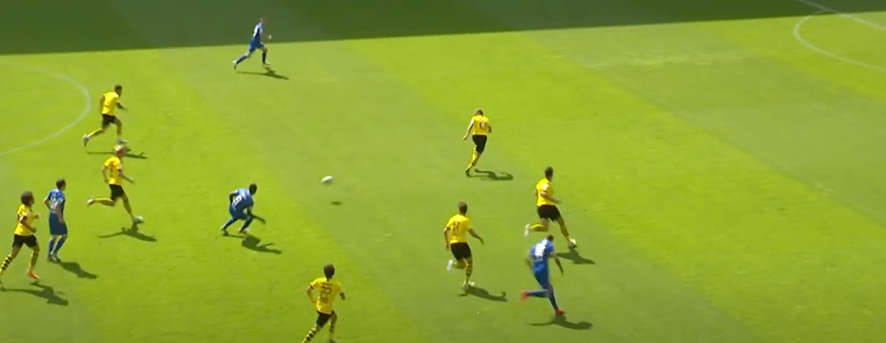 Es entsteht Haalands Lieblingssituation, in der in den Raum hinter dem Rücken des letzten Abwehrspielers sprintet, den Steilpass erhält und einschiebt.