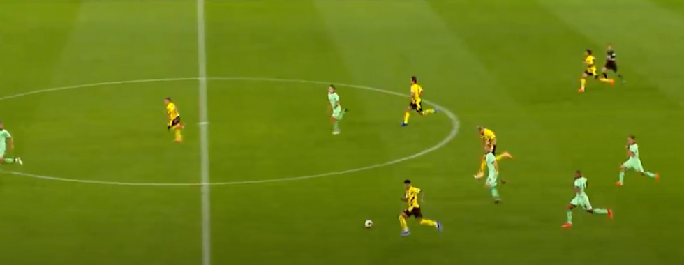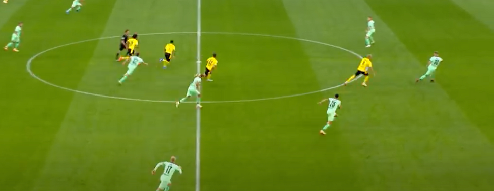 Oftmals stößt dann einer der Innenverteidiger bis weit in die gegnerische Hälfte vor, in diesem Fall Akanji. Die extrem breit gestaffelte Offensivreihe bilden der auf der ballfernen Seite weit aufgerückte AV (Meunier), der ballferne periphere Zehner (Reyna), Zielspieler Haaland, sowie der auf den Flügel abkippende zweite 10er (Reus).