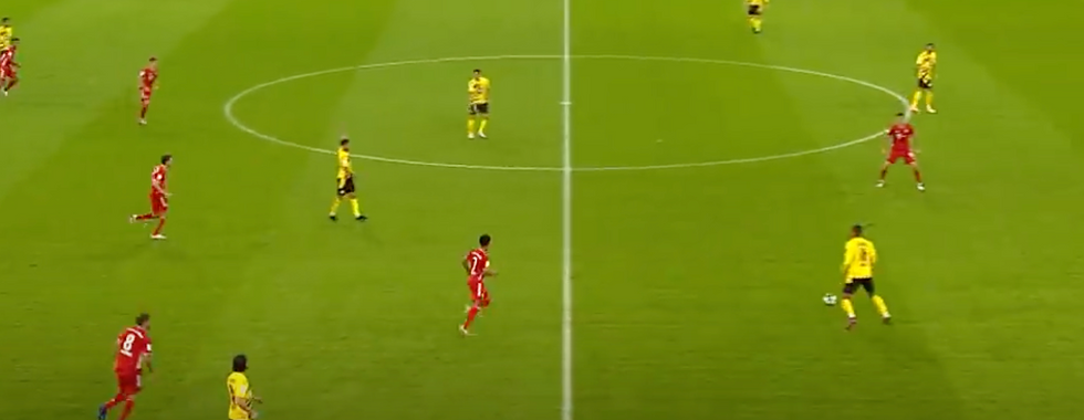 Die Bayern bieten dem Dortmunder Gegner eigentlich genug Platz, um das Spiel weiter aufzubauen, setzen dann jedoch in Person von Kimmich schlagartig nach und kommen zum Ballgewinn. Nun rächt sich die extreme Breite und das hohe Aufgerückt-Sein des BVB.