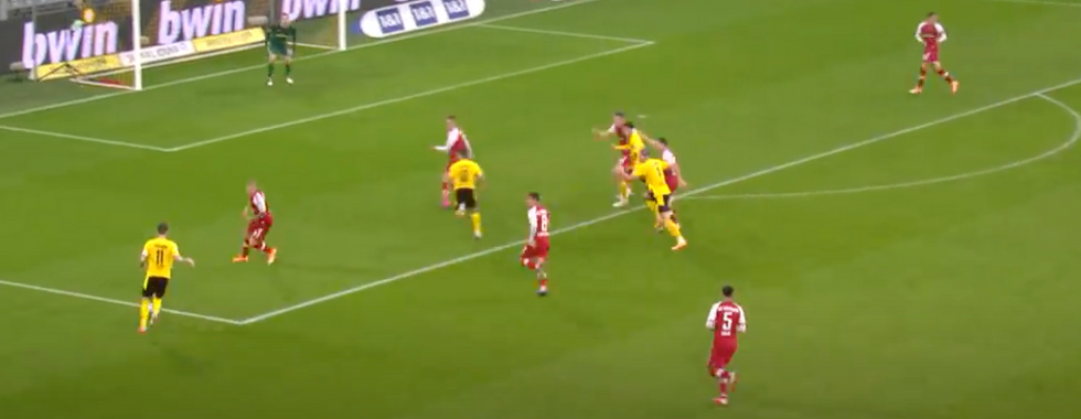 In diesem Fall stehen die Dortmunder eigentlich ungewohnt tief, schaffen es aber den Gegner auf dem Flügel unter Druck zu setzen. Während Haaland den einfachsten Passweg an der Linie entlang zu macht, läuft Reus mit Tempo in den Rücken des Gegenspielers, dem die Ruhe abhanden kommt. Eigentlich bieten sich ihm sowohl in der zentralen Horizontalen (ballferner 6er), als auch in der Vertikalen auf den anderen 6er sowie den Innenverteidiger genügend Anspielstationen. Diese sind zumindest aber schon einmal fehleranfälliger als der einfache, nun zugestellte Pass an der Seitenlinie entlang.