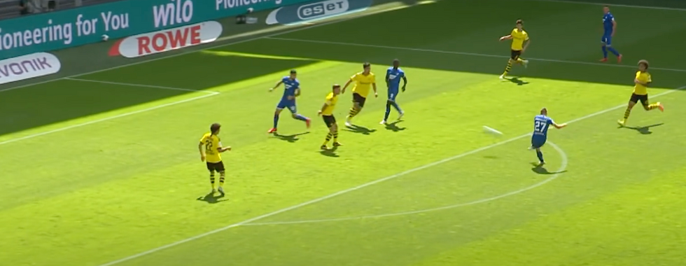 Eine letzte Szene soll einen Fakt des Dortmunder Spiels beleuchten, den sich die TSG durch Kaderabek Größe und Kopfballstärke nicht nur in der gegnerischen Box, sondern auch generell im Mittelfeld auf den Flügeln ausnutzen kann.